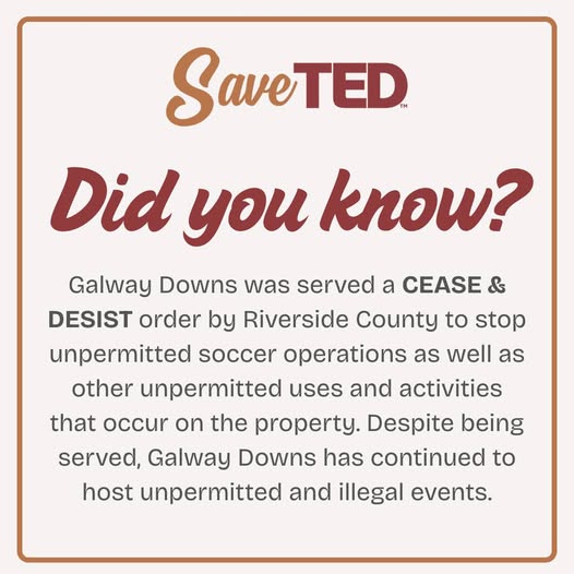 Save TED filed a lawsuit against Galway Downs to stop ongoing unpermitted and unlawful land use on Galway Downs property – specifically the recurring soccer events and other large events that have bypassed proper approval, burdened local resources and have not considered the impact on our community. Read the lawsuit here.